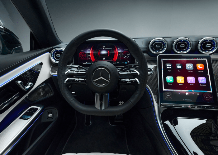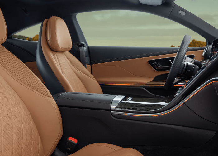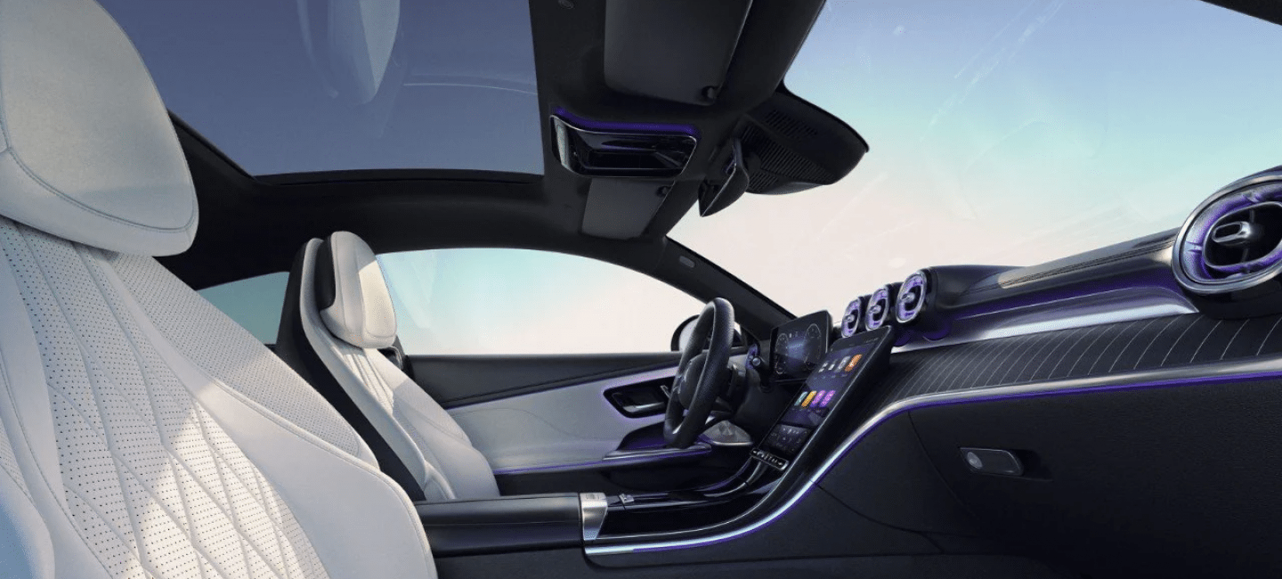 Blikvangers in het interieur zijn het vrijstaande, volledig digitale 12,3” combi-instrument, het op de bestuurder gerichte 11,9” centrale display in gebruiksvriendelijk staand formaat en de dynamische sfeerverlichting met 64 kleuren. Deze kan desgewenst vanaf de middenconsole doorlopen tot onder de buitenste luchtuitstroomopeningen. In elk van de portieren loopt een lichtstrook langs de contouren van de armleuning en de bovenkant van de portieren naar achteren toe. Een andere highlight zijn de exclusief voor de CLE ontwikkelde voorstoelen in integraaldesign. In combinatie met het optionele Burmester® 3D-surround sound system beschikken ze elk over twee luidsprekers ter hoogte van de hoofdsteunen en creëren zo een bijzonder individuele en intense muziekbeleving met Dolby Atmos en Spatial Audio dicht bij de oren.
